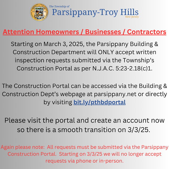 Our goal is to provide the best possible customer service while ensuring that all construction within the Township is code complaint for the safety and welfare of all who live, work and visit Parsippany-Troy Hills.