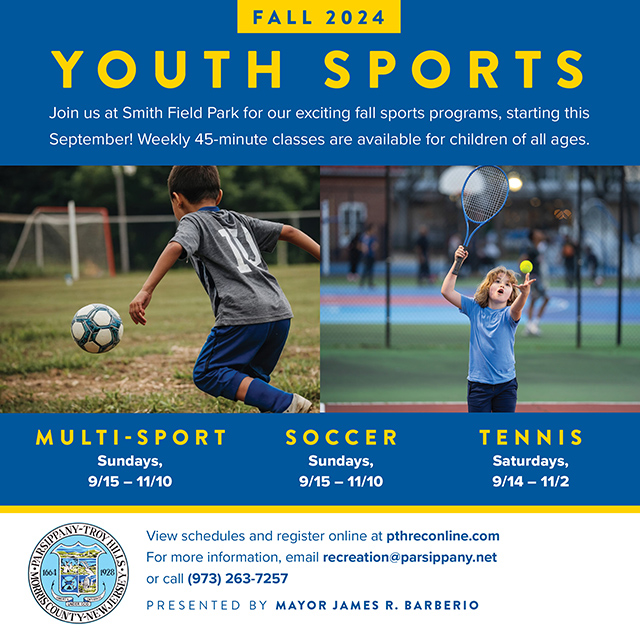 Fall Sports in Parsippany are here! Register now for 45-minute weekly classes in Multi-Sports, Soccer, and Tennis at Smith Field Park, starting this September. Perfect for kids of all ages. Sign up today at www.pthreconline.com. For more info, contact recreation@parsippany.net or 973-263-7257.