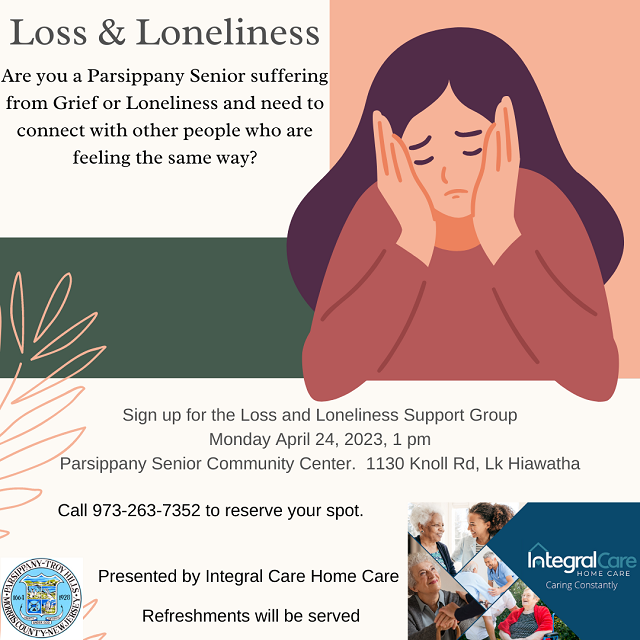 Sign up for the Loss and Loneliness Support Group - April 24, 2023, 1 pm @ the Parsippany Senior Community Center.